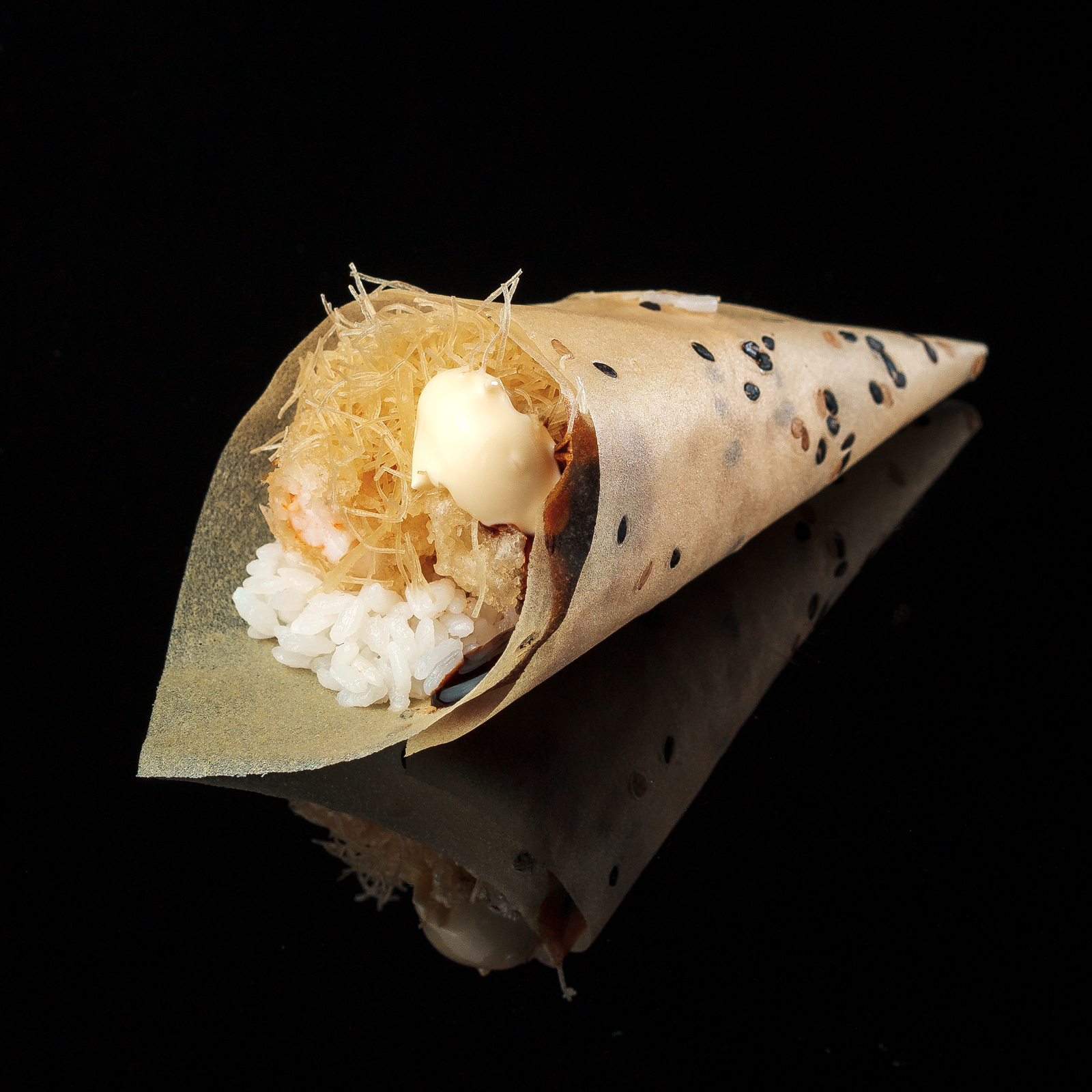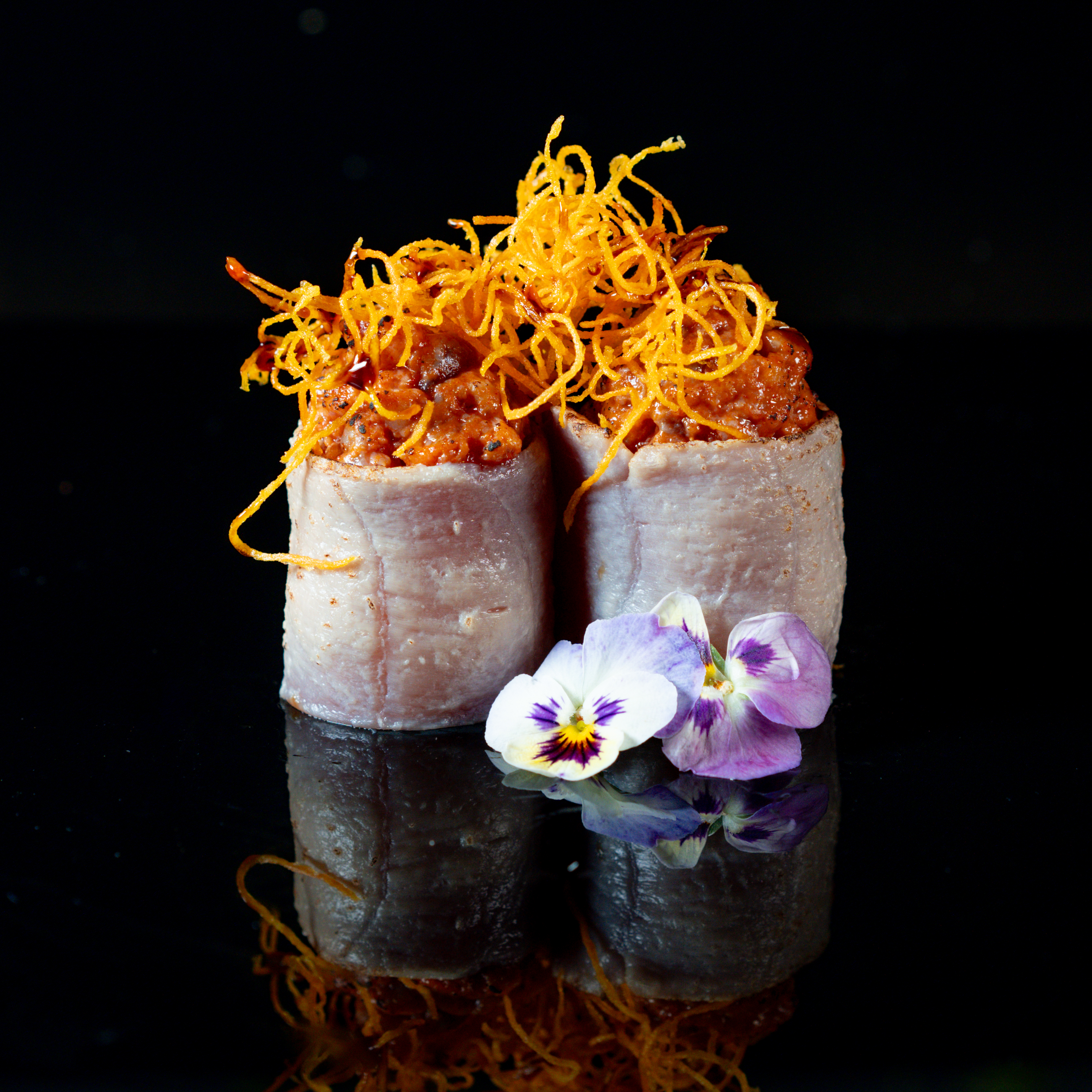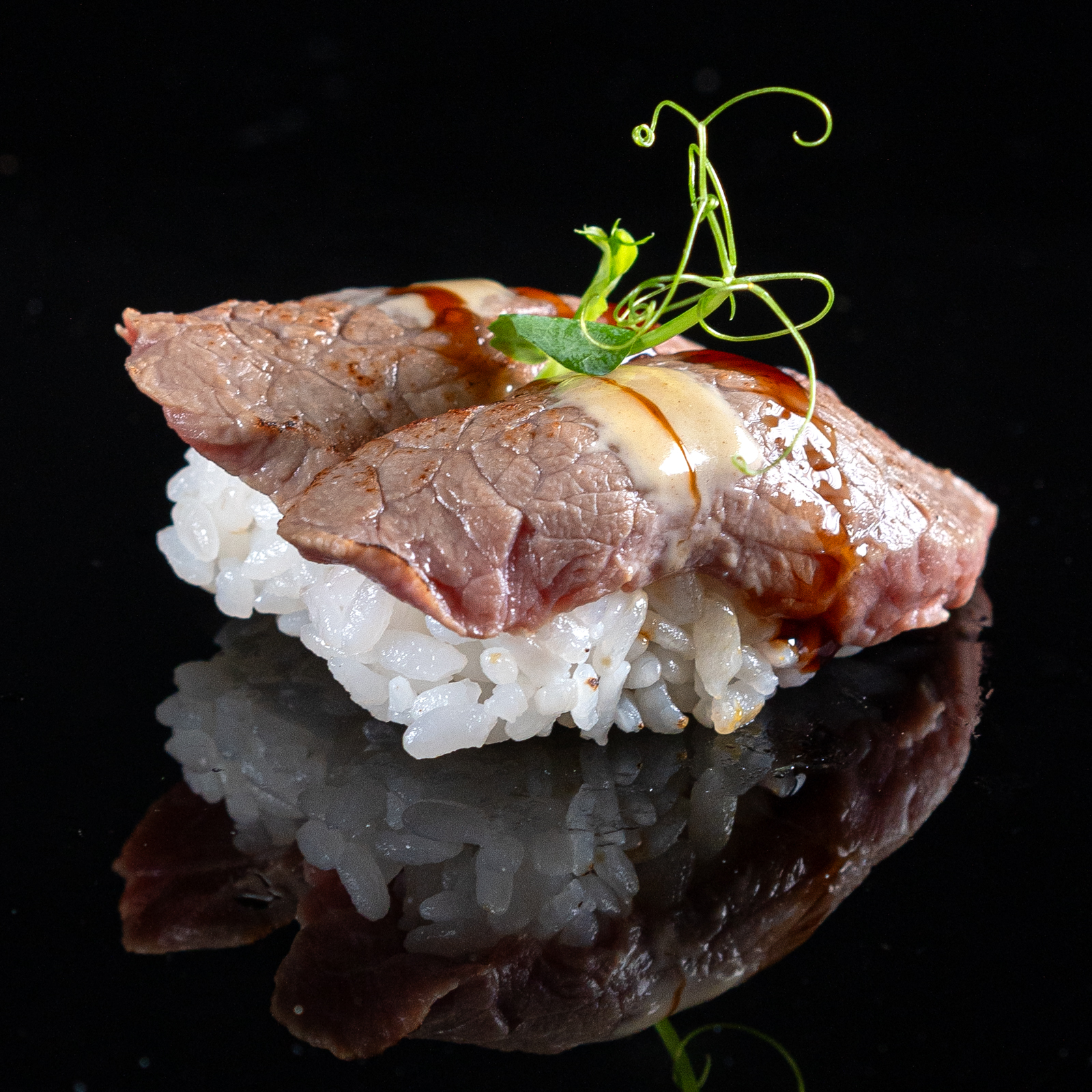 bocconcino di riso, manza sottofesa piemontese tagliata finissima ee scottato, guarnito con salsa senape, teriyaki
