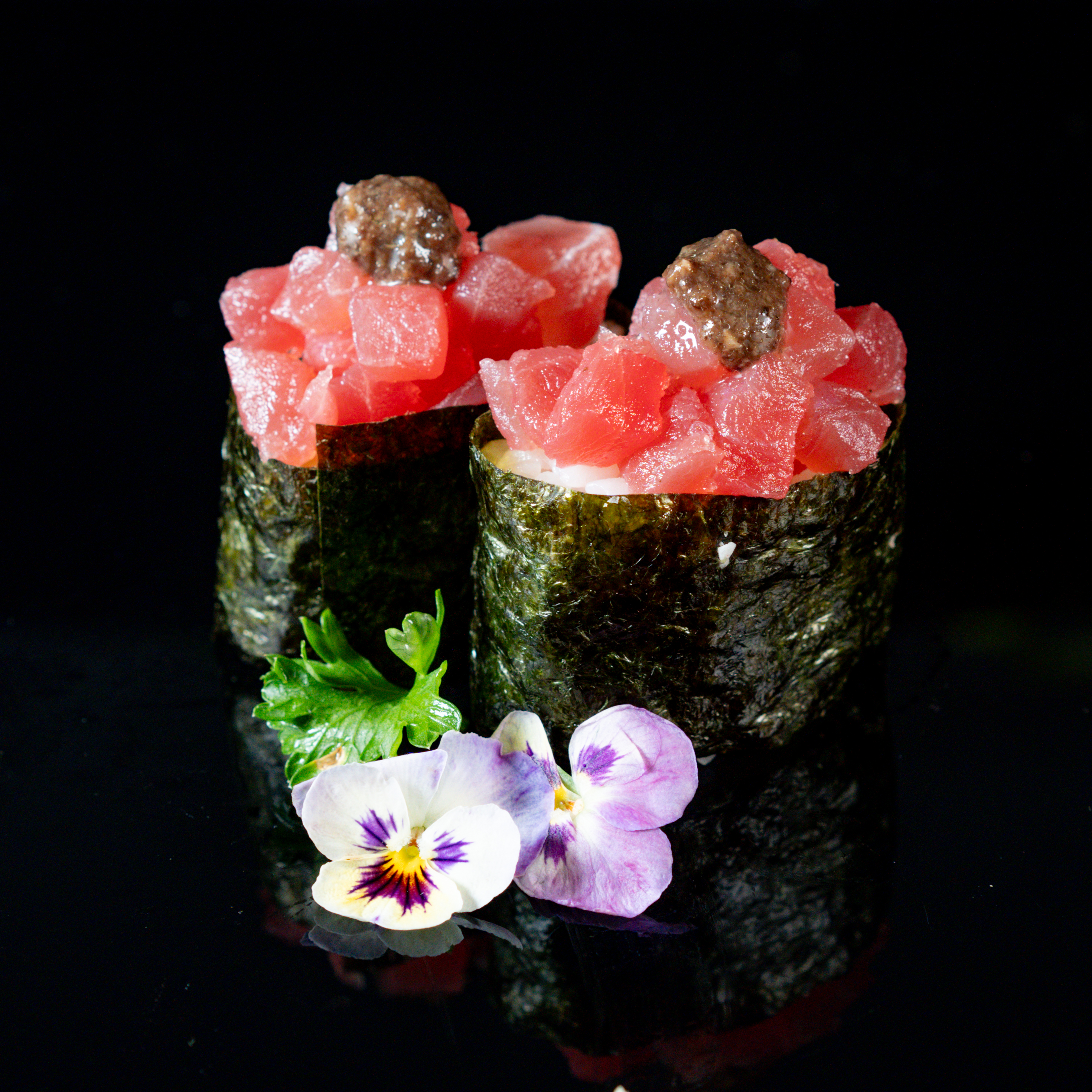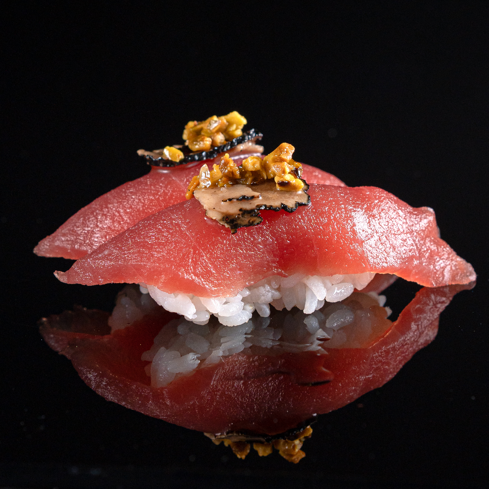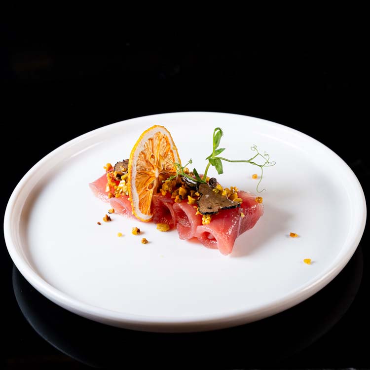 Carpaccio di tonno, tobiko, elio evo, scaglie tartufo, granelli di pistacchio. GLUTEN FREE. Specificare nell'ordine se si è celiaci.