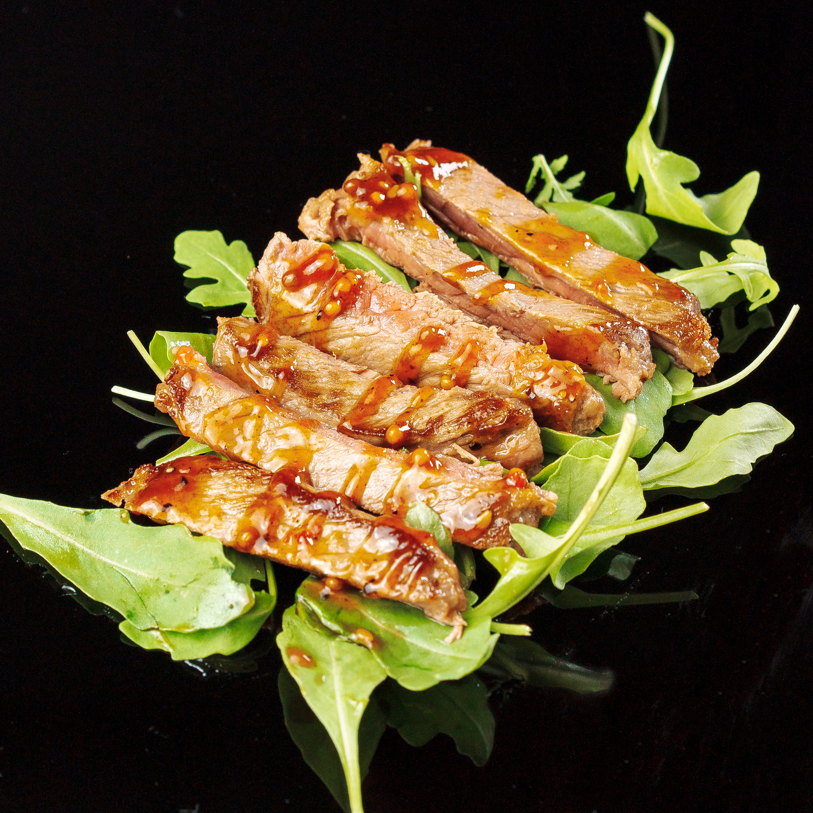tagliata di roastbeef scottato alla piastra sul letto di rucola, sale , olio evo, pepe, salsa barbecue