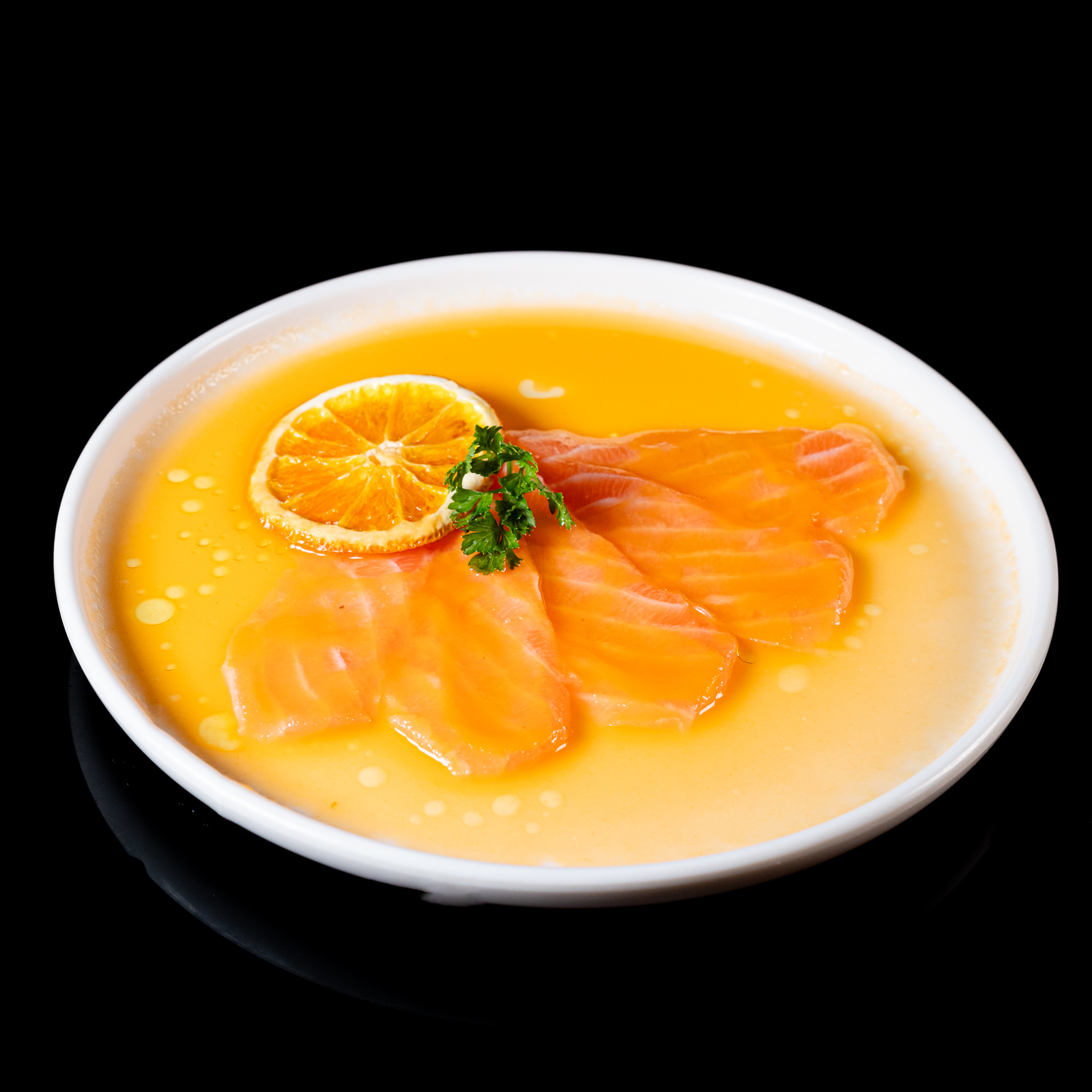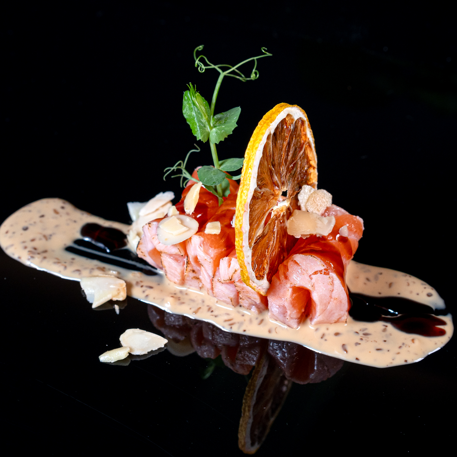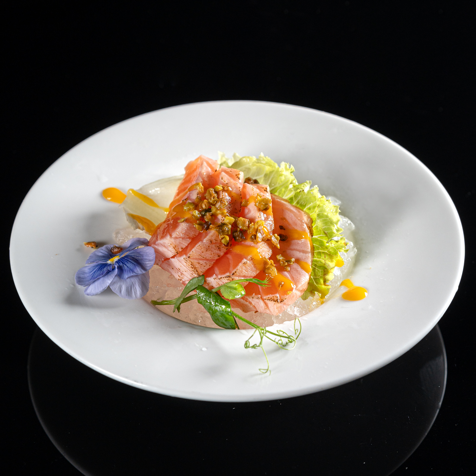carpaccio di salmone, sale, pepe, olio evo, estratto di agumi