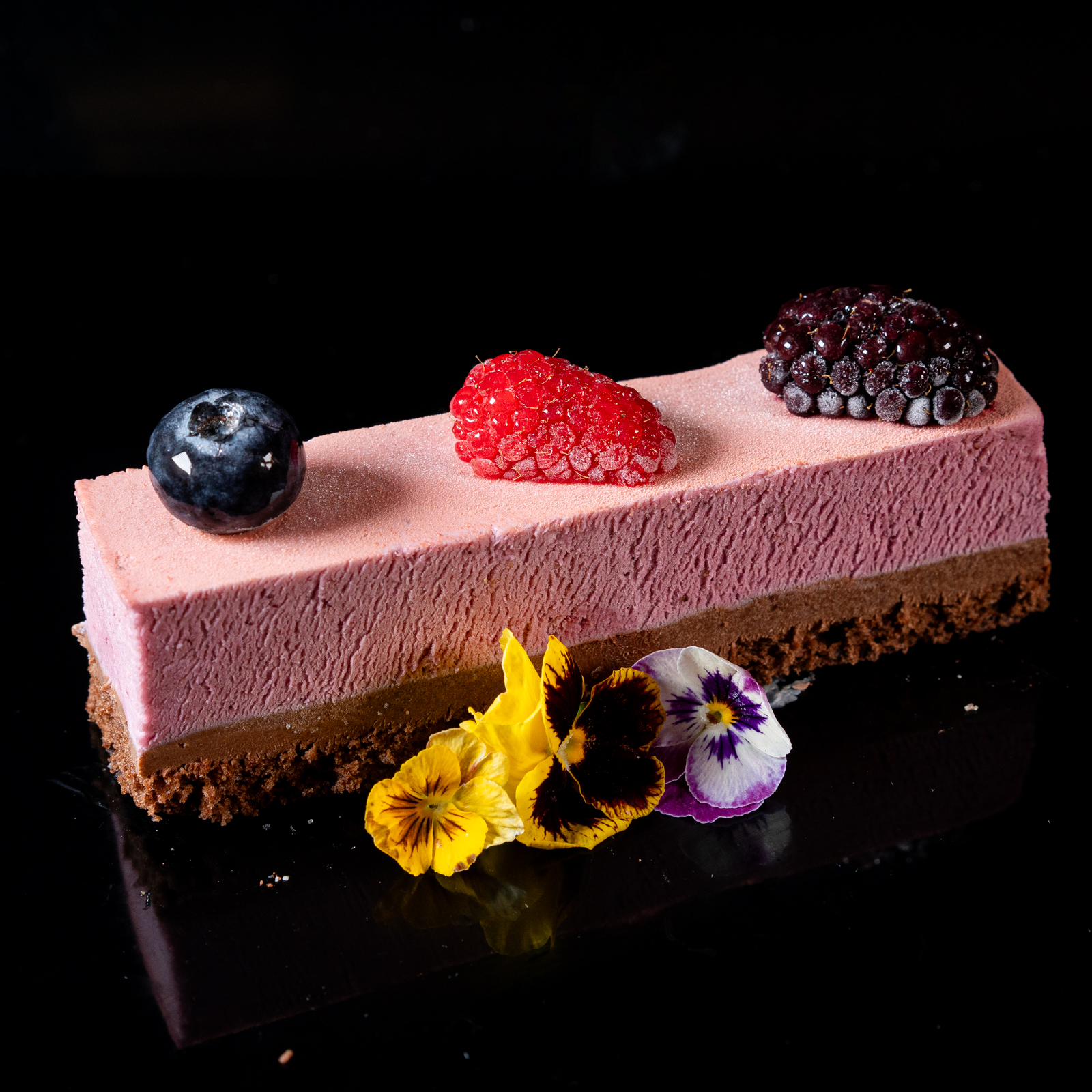 Biscotto morbido al cioccolato. Mousse ai frutti di bosco cremosa.