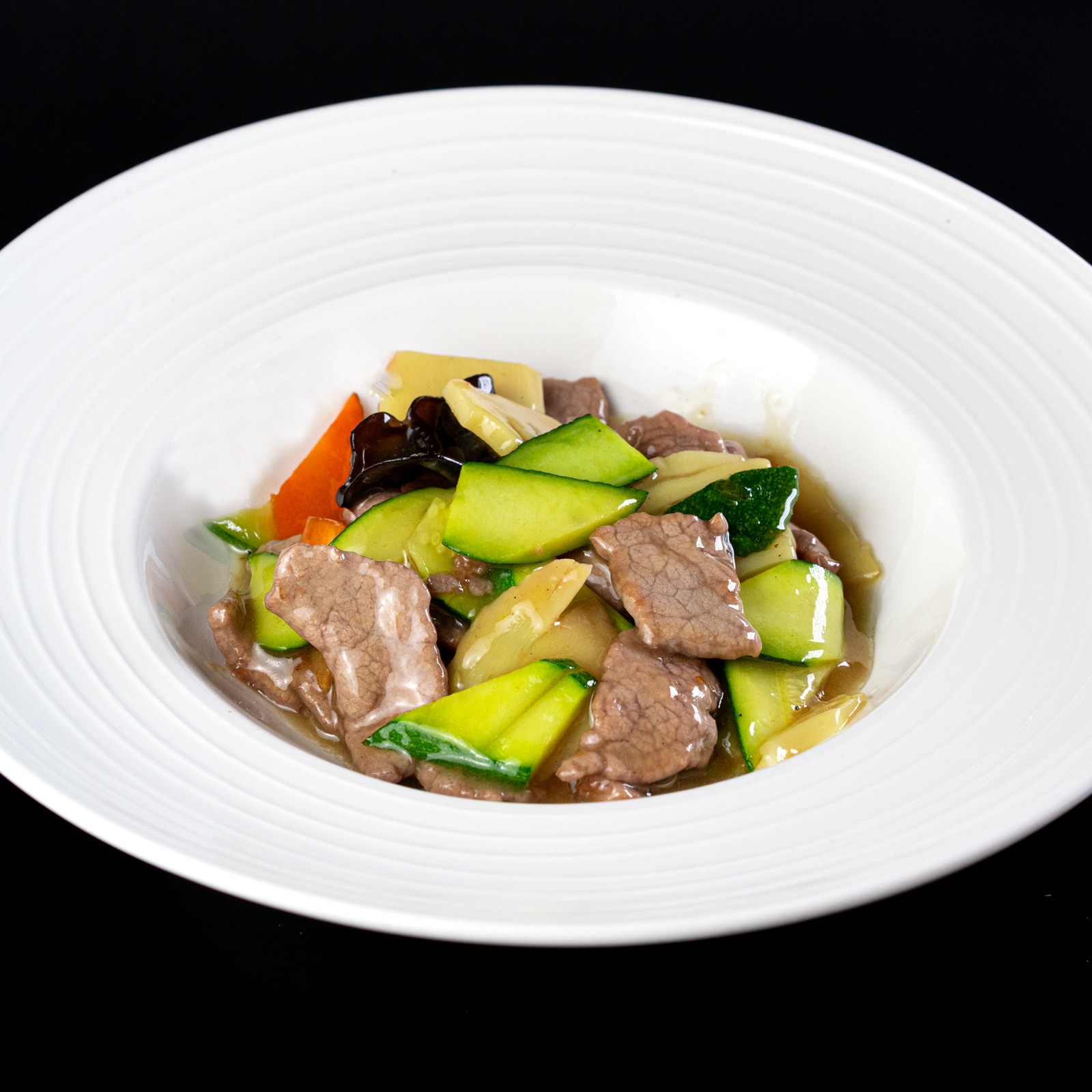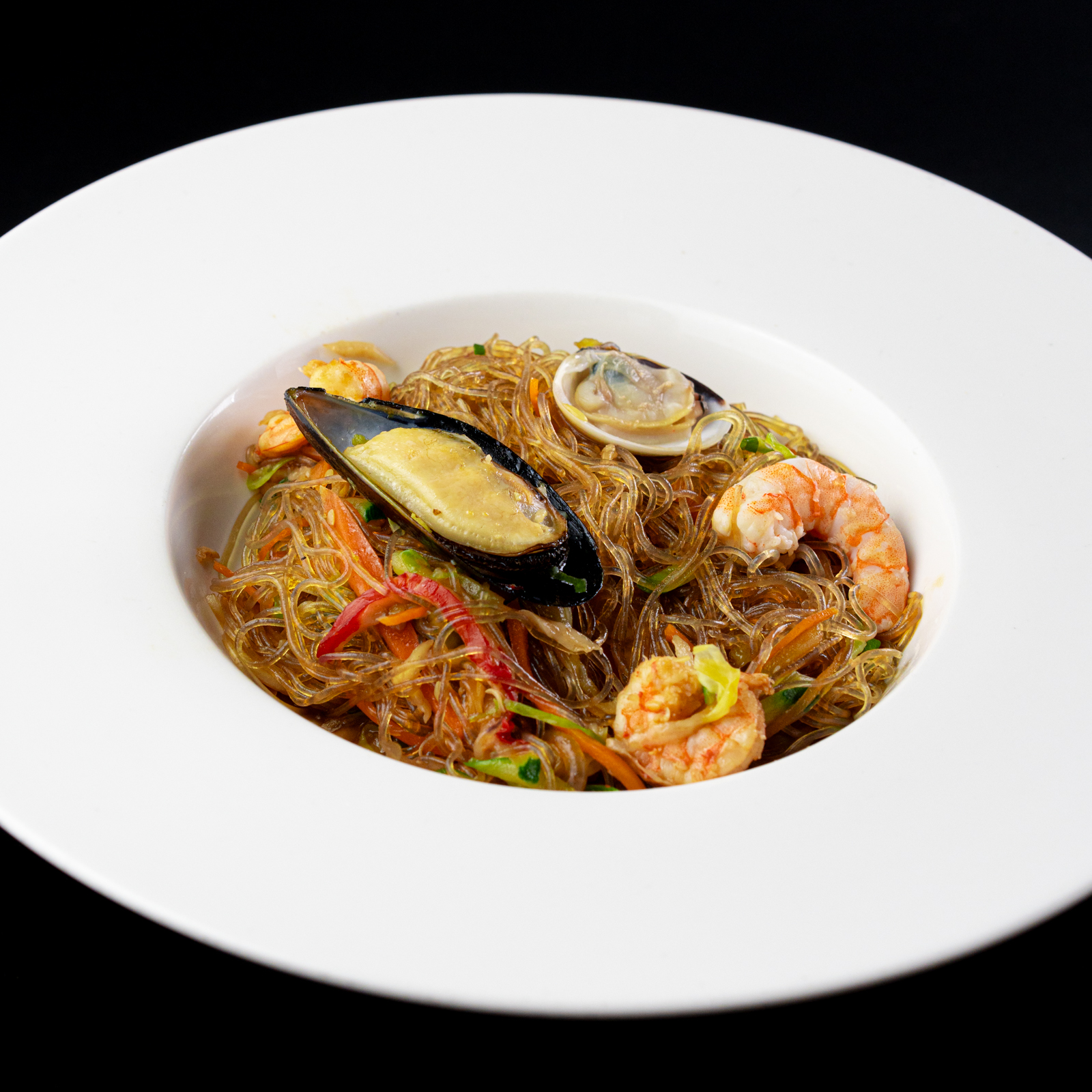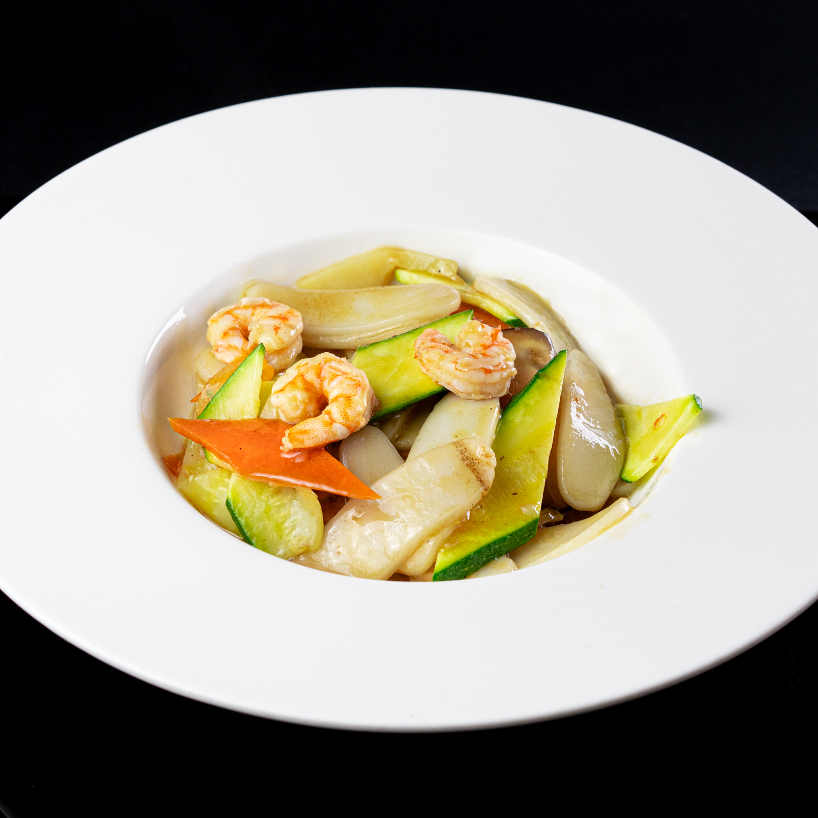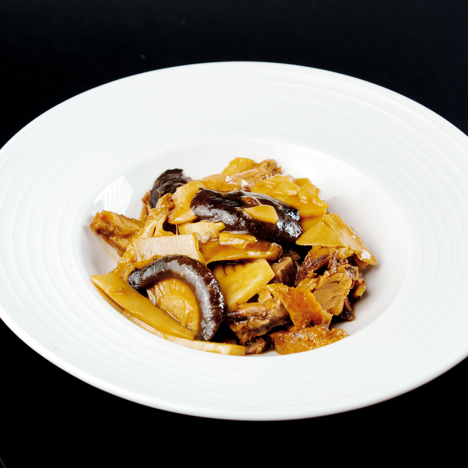 Sfoglia di soia, lonza di maiale, funghi shiitake, cipollotto, verdure
