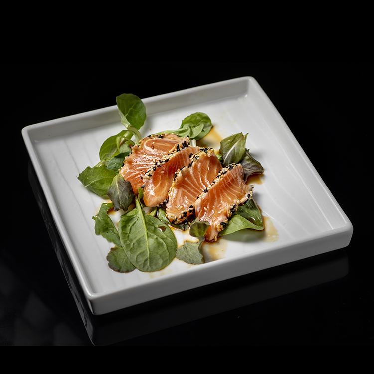 Salmone scottato con sesamo, servito con salsa tataki. GLUTEN FREE. Specificare nell'ordine se si è celiaci.