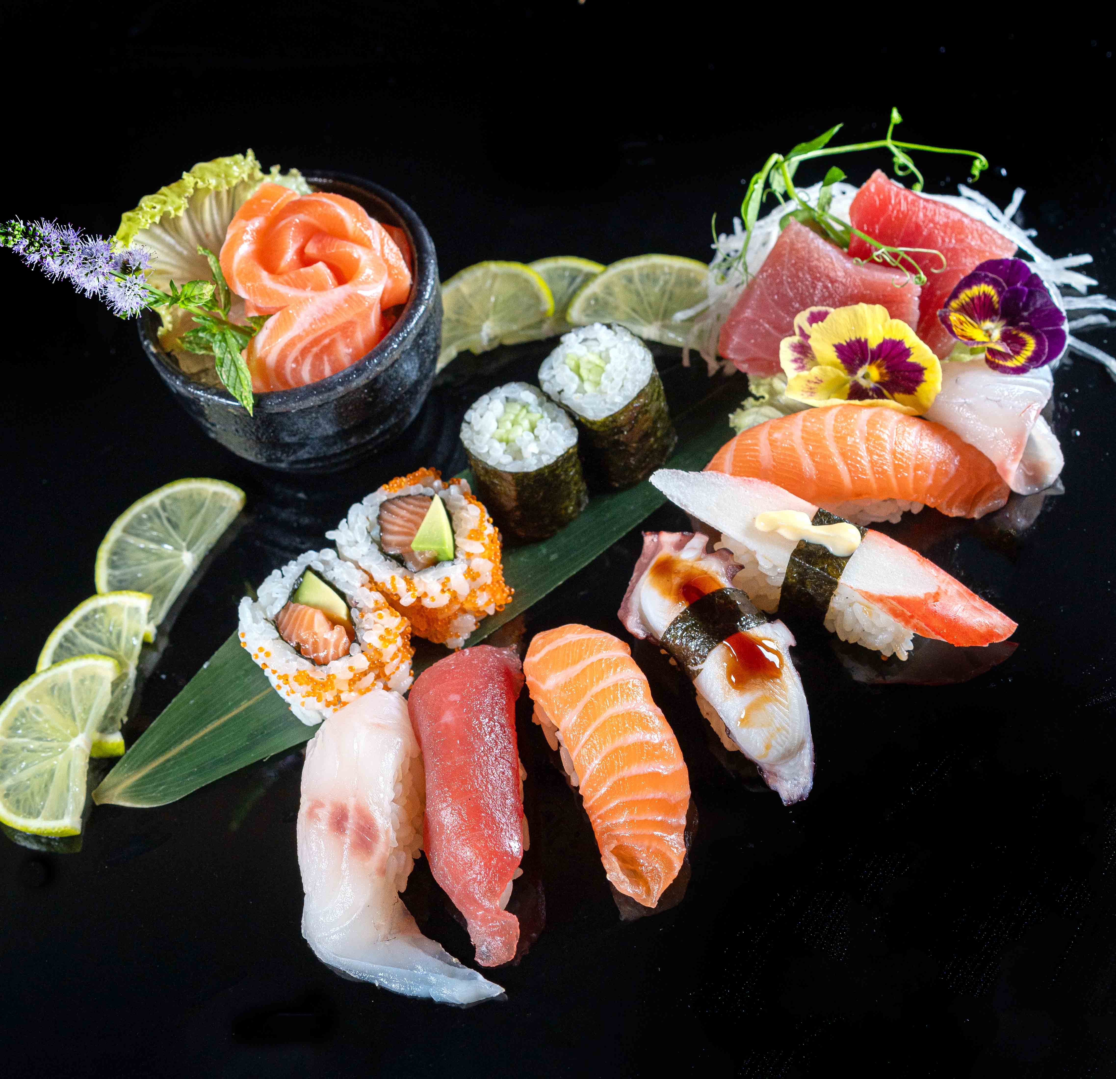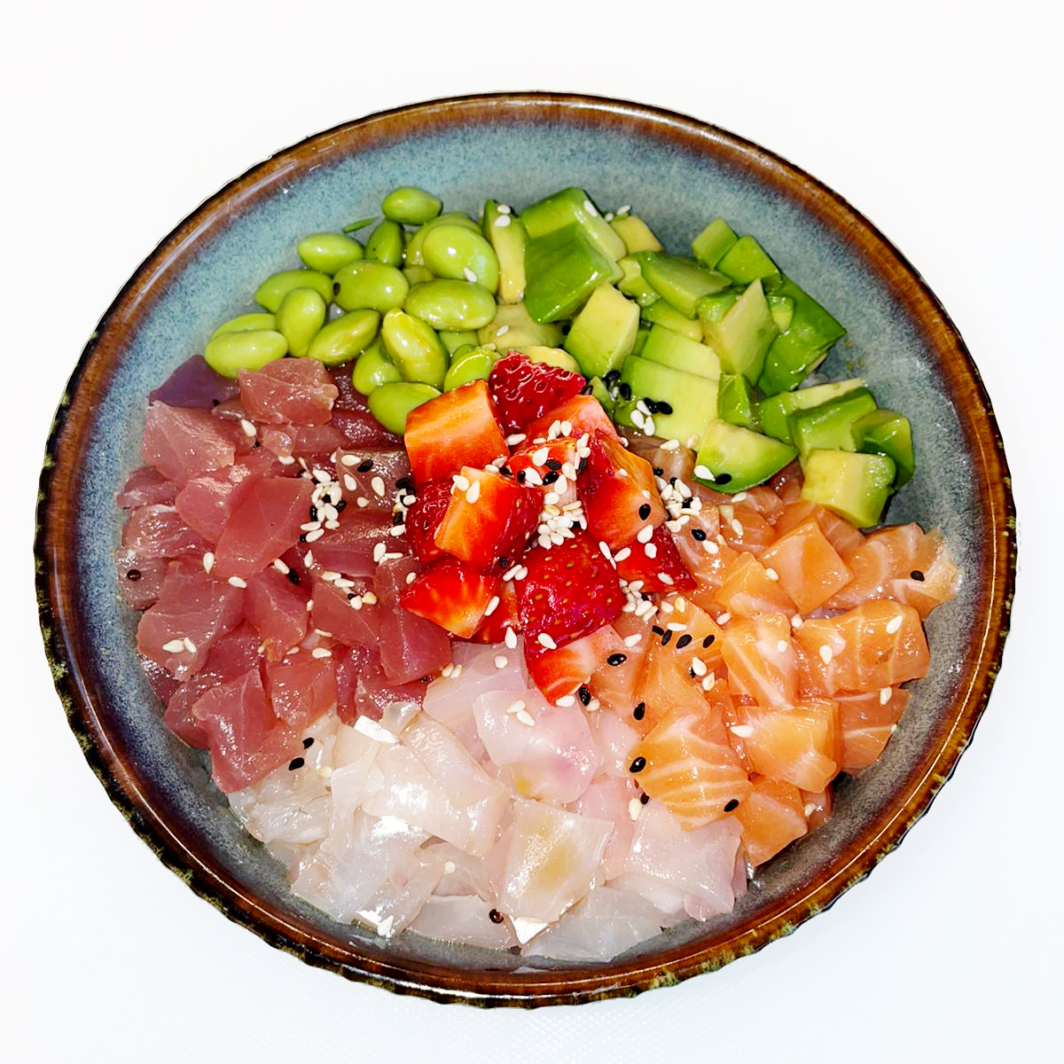 Salmone, tonno, branzino, edamame, frutta fresca, avocado e salsa lumii