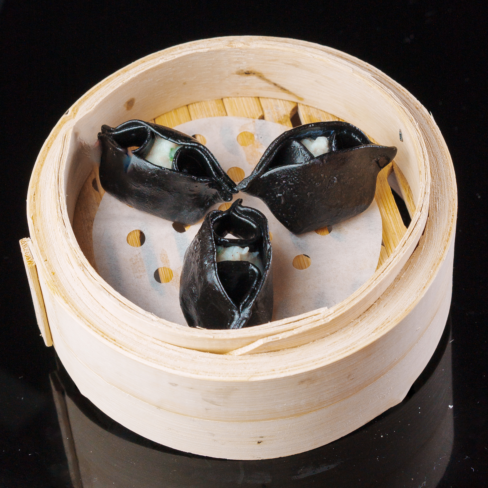Ravioli con ripieno di calamaro, zenzero, nero di seppia