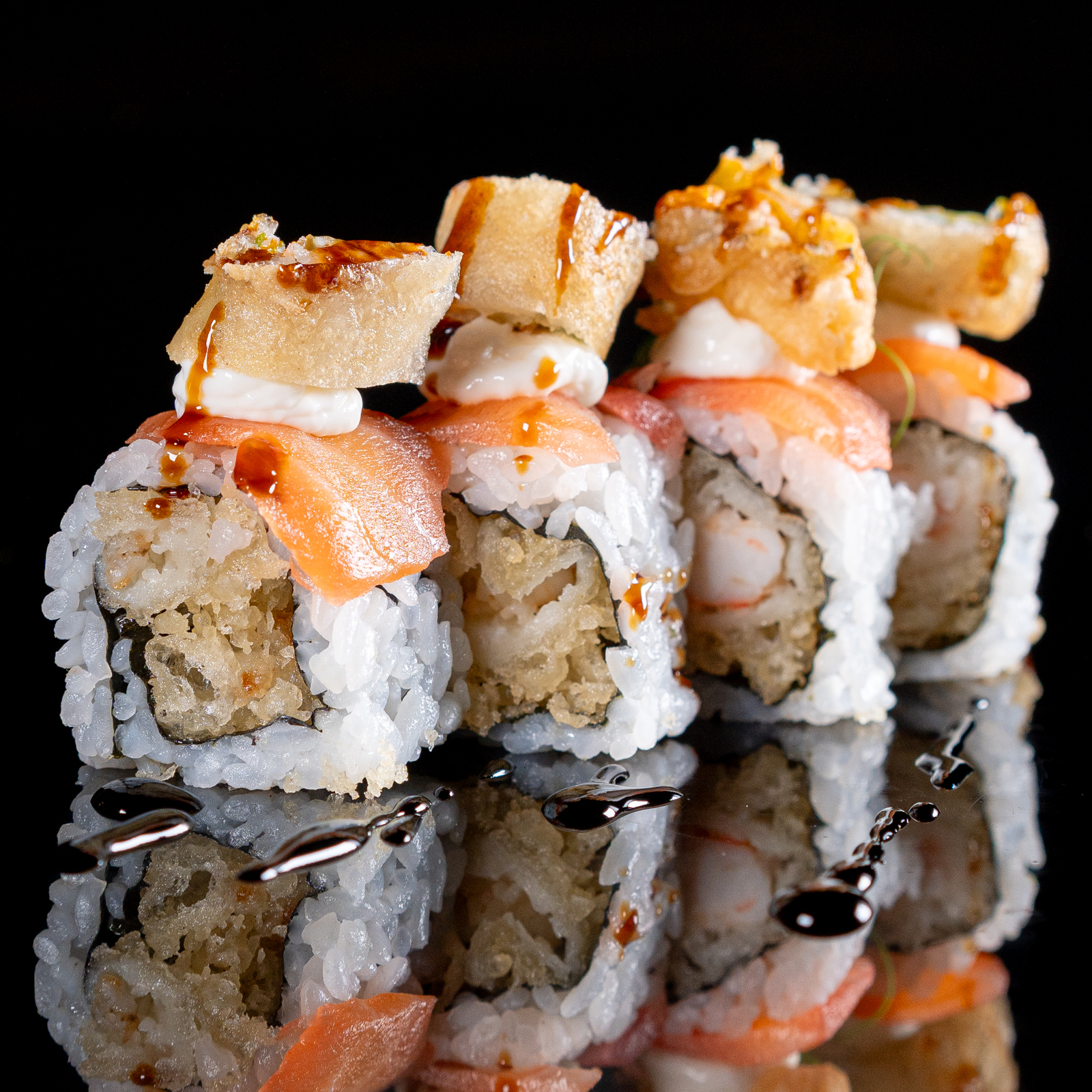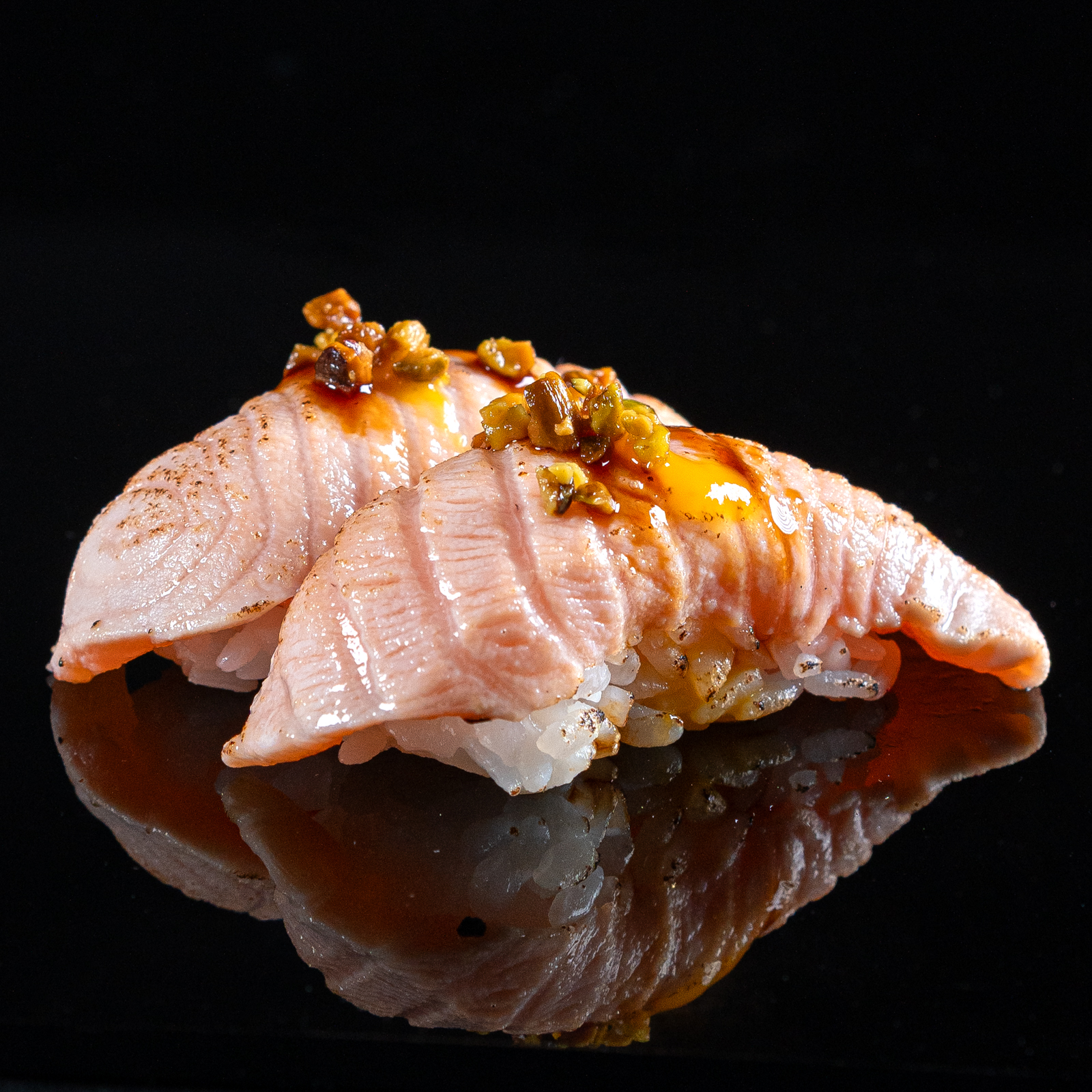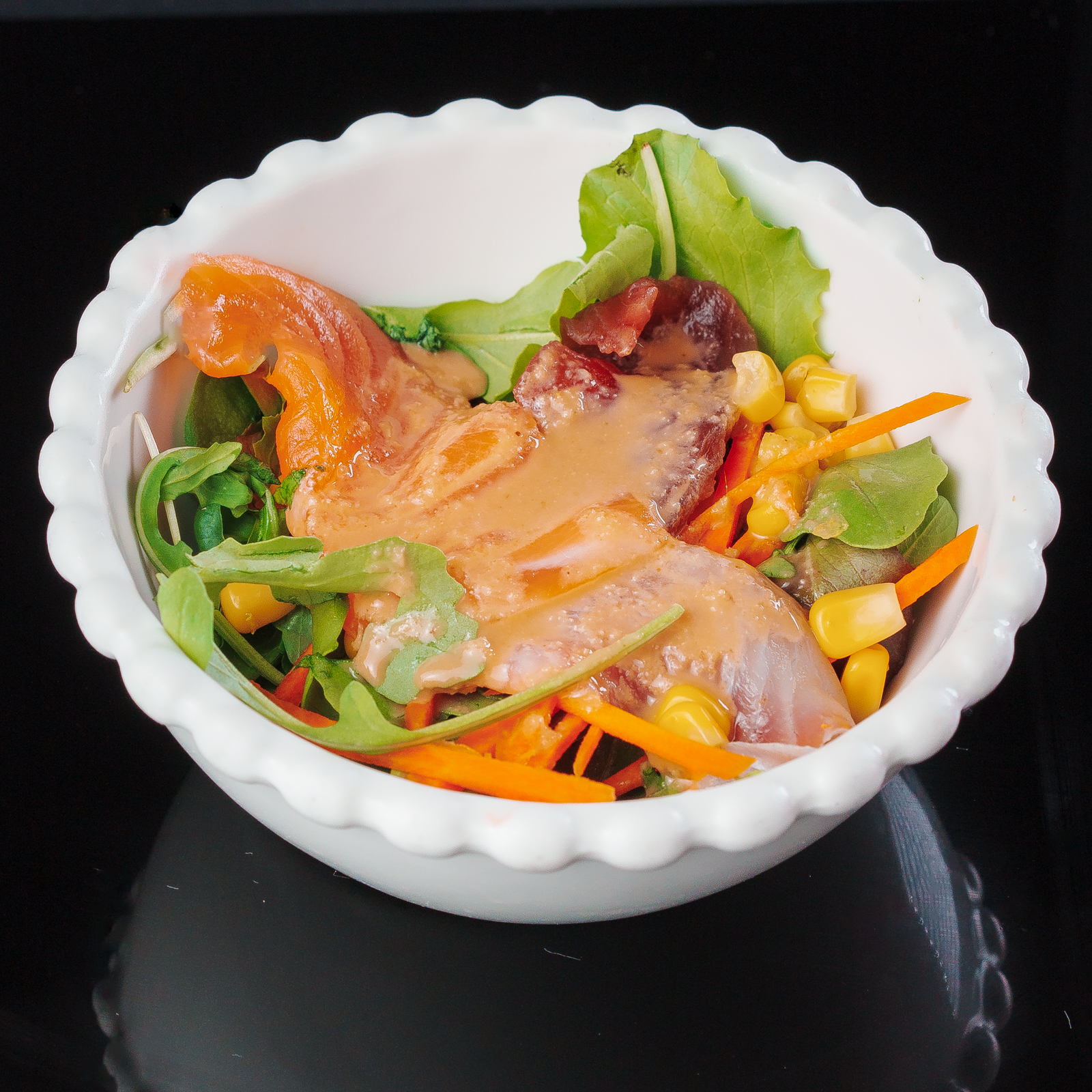 Salmone scottato, spicy maionese, crema latte e teriyaki