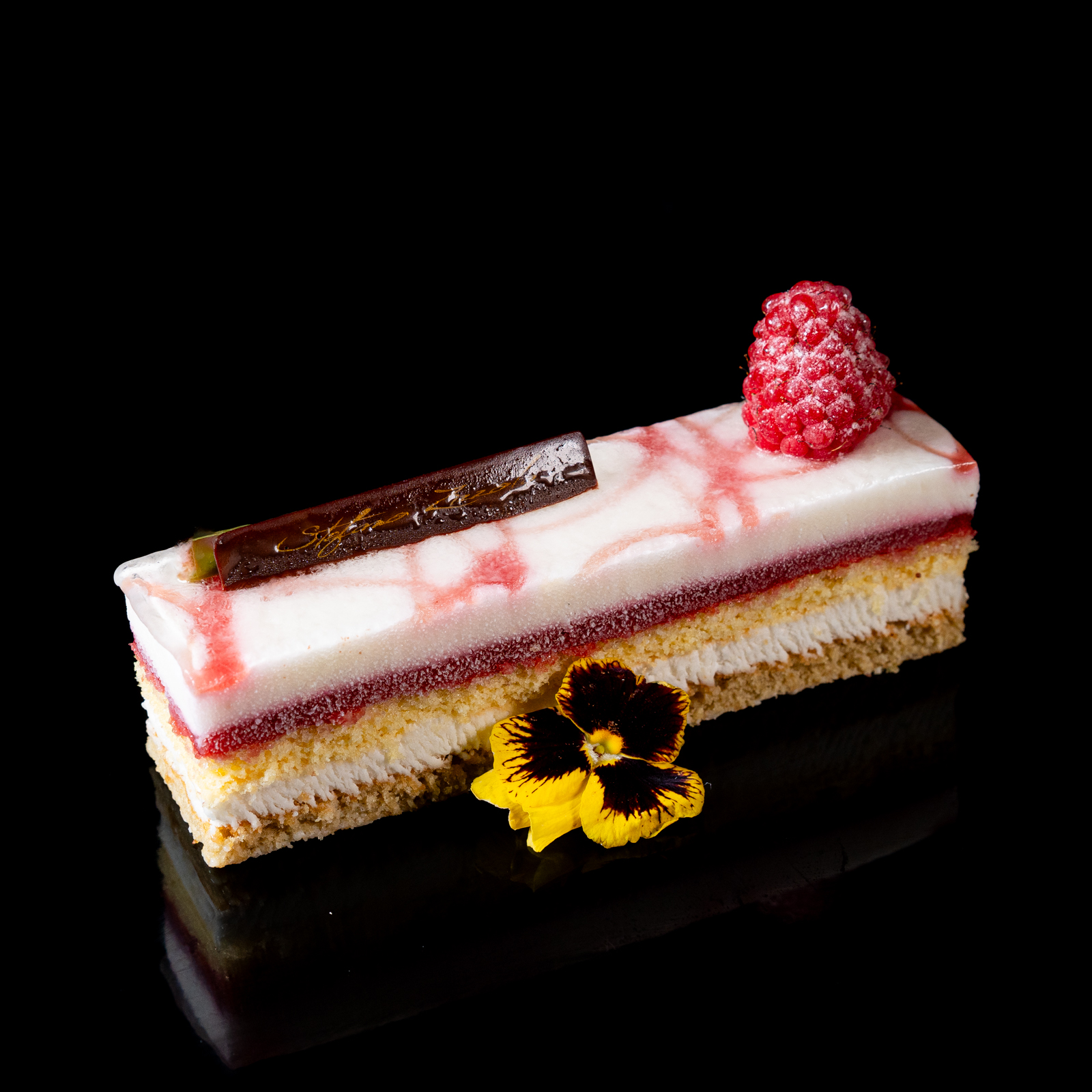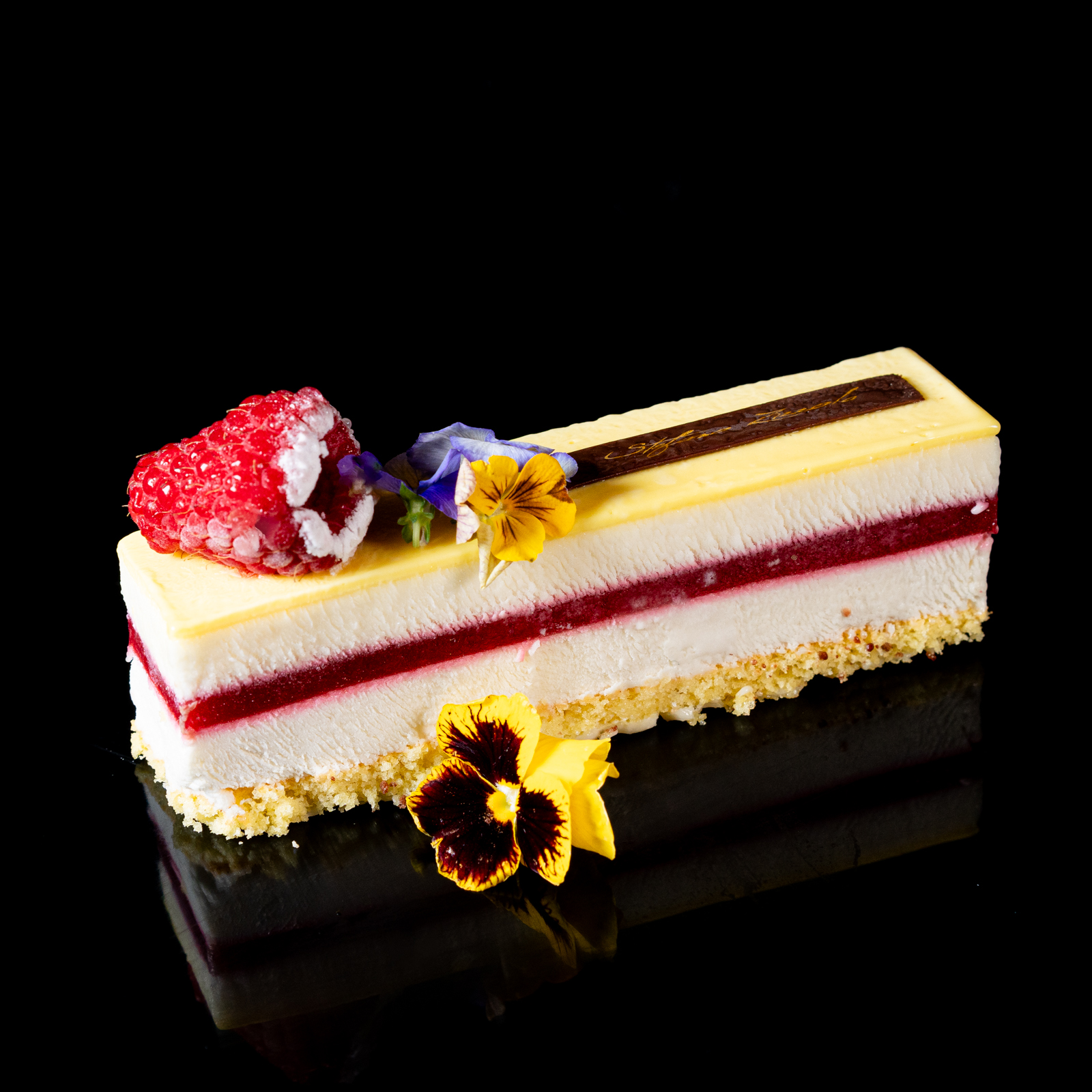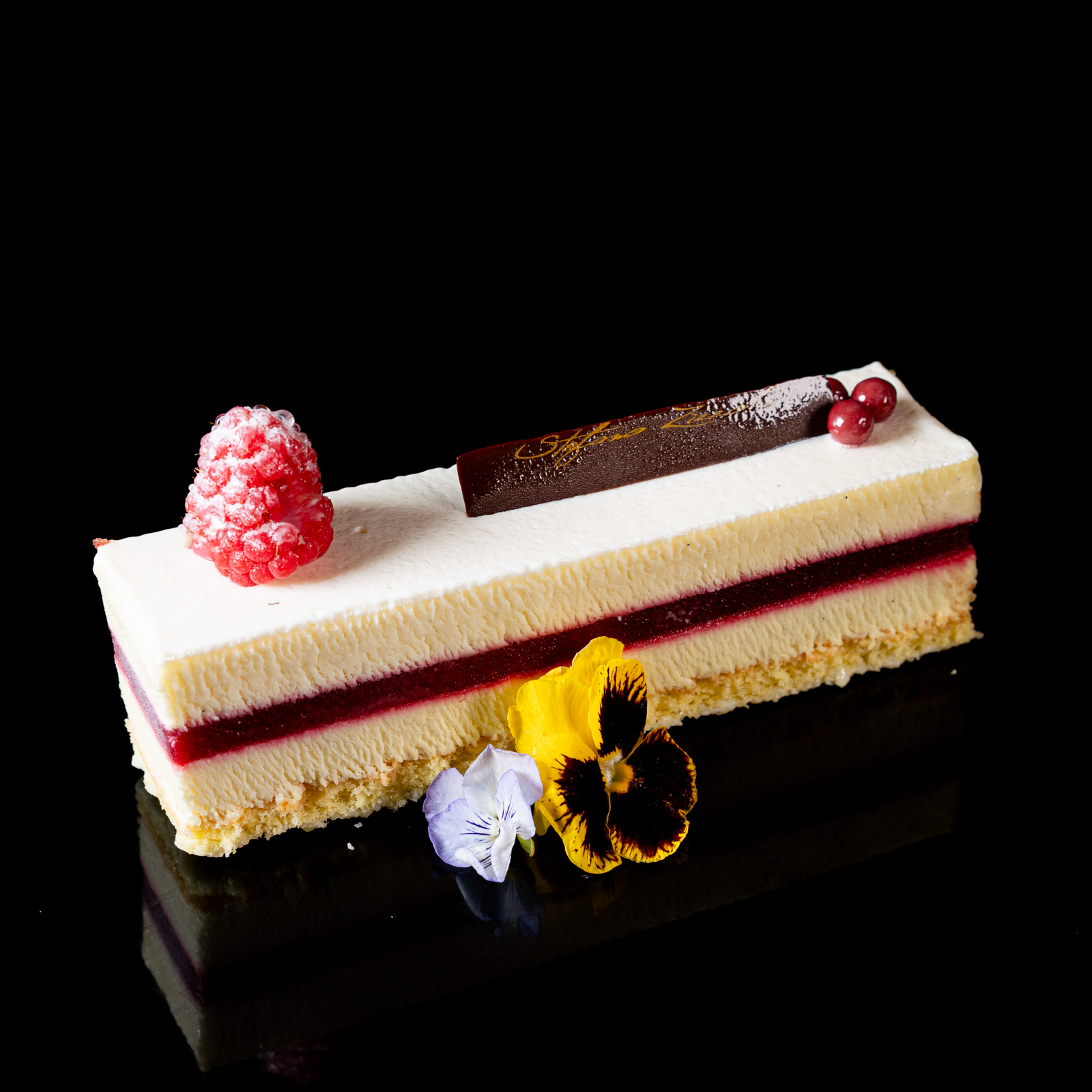 Biscotto morbido alle mandorle. Polpa di lamponi freschi. Mousse al cioccolato bianco.