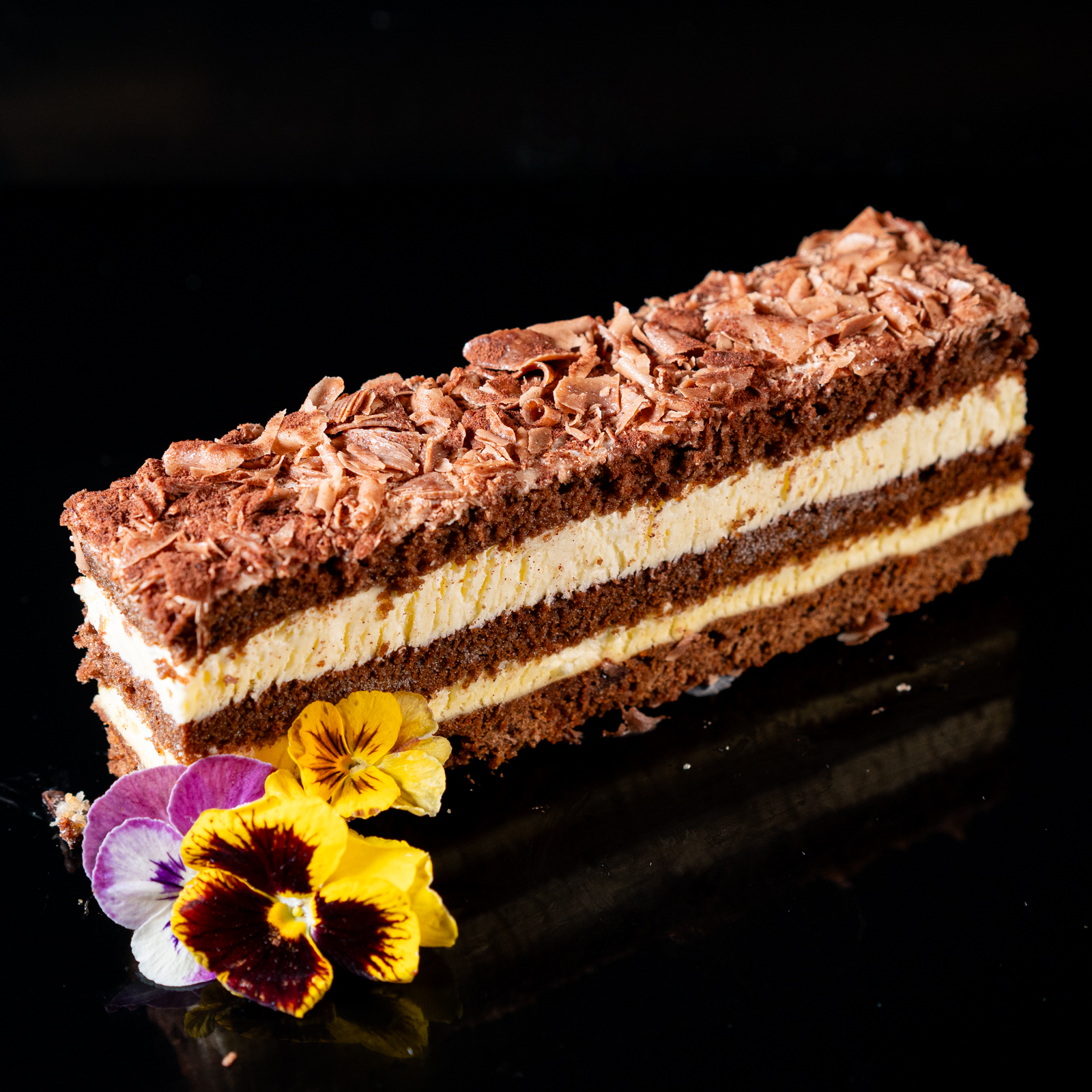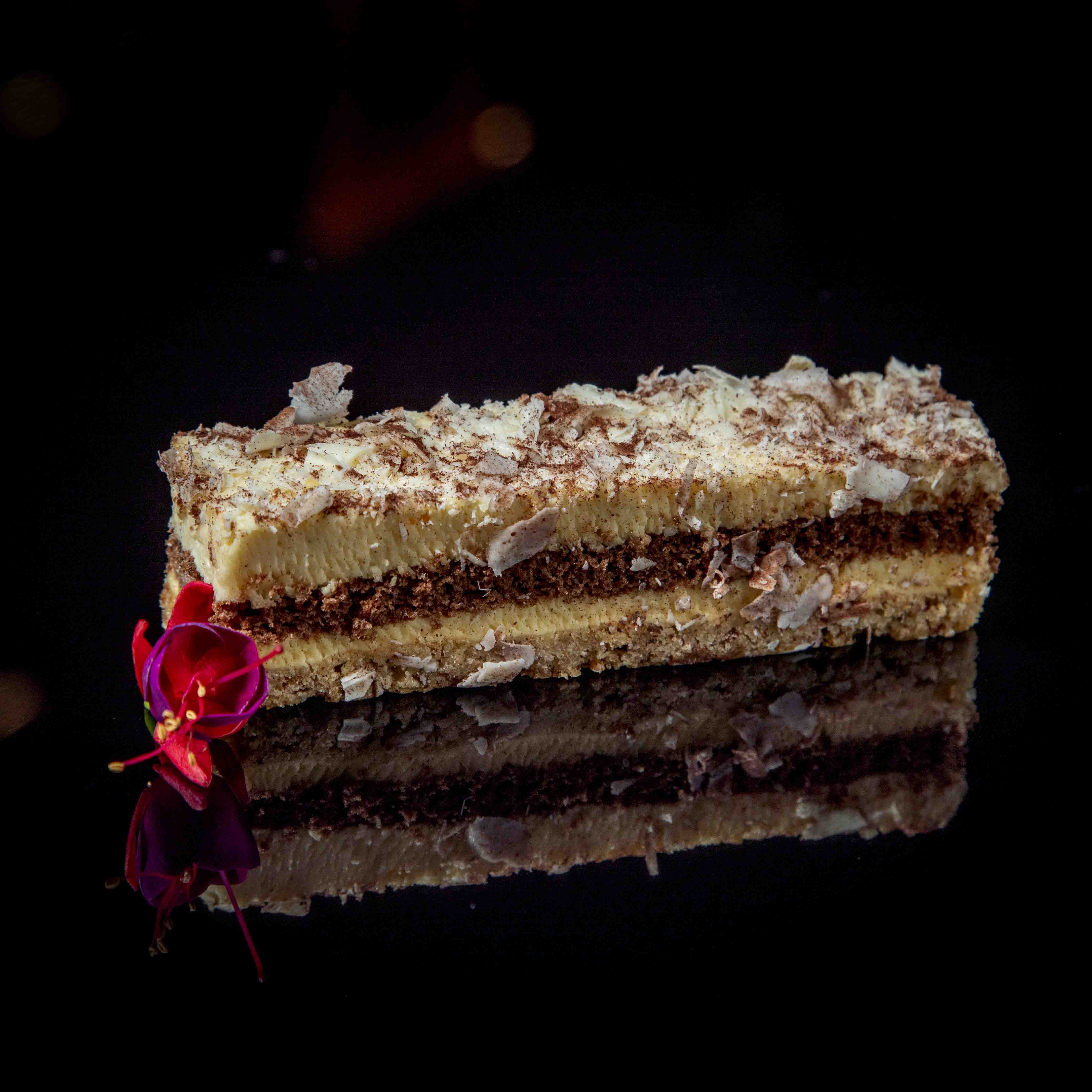 Crema leggera al mascarpone, pan di spagna al cioccolato profumato al caffè e croccante frolla alle mandorle e cacao.