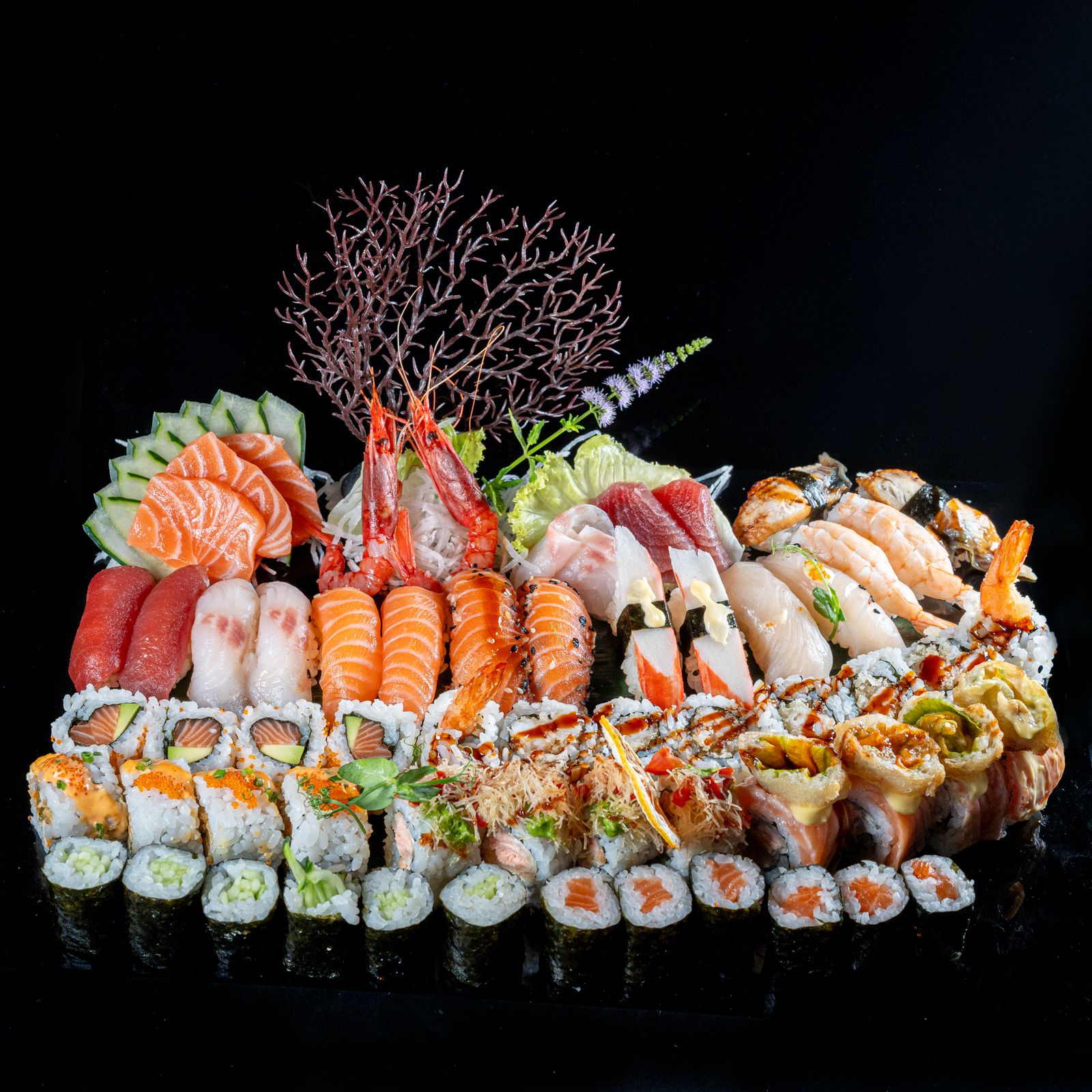 4pz salmone, 3pz tonno, 3pz branzino, 1gambero rosso, 1scampi. GLUTEN FREE. Specificare nell'ordine se si è celiaci.