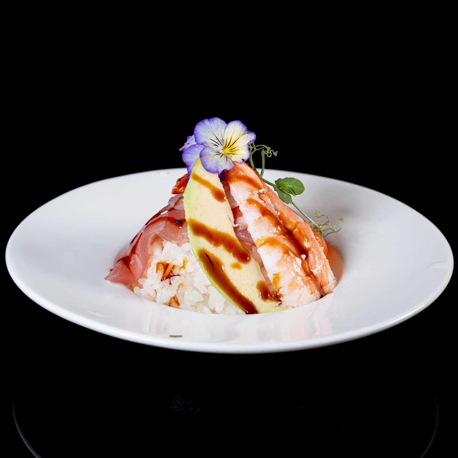 riso con crpaccio di salmone, branzino, tonno, gambero cotto, avocado, ikura, sesamo, salsa teriyaki. questo piatto puoi essere oridinato anche dalle persone celiaci specificando nella notazione senza salsa teriyaki.