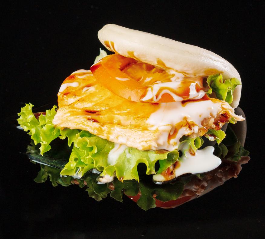 Pane orientale a vapore farcito con salmone alla piastra, insalata, pomodoro, Teriyaki, salsa Caesar