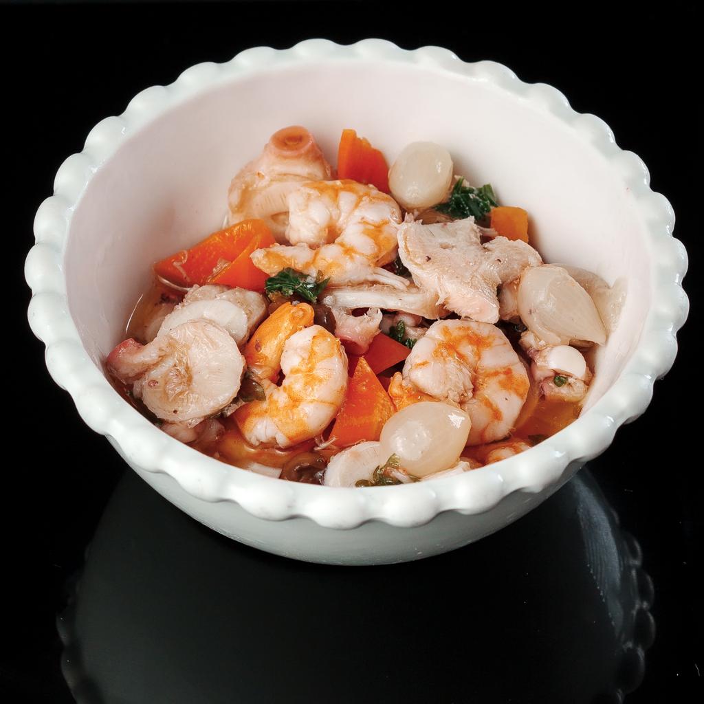 Frutti di mare marinato sotto aceto, olio extravergine, olive, pepe, prezzemolo
