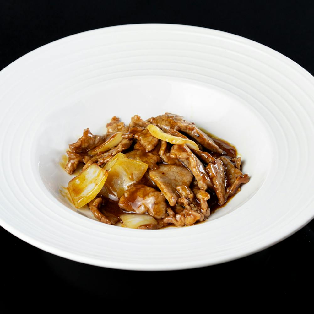 Bocconcino di manzo saltato con cipolle e peperoni, salsa piccante