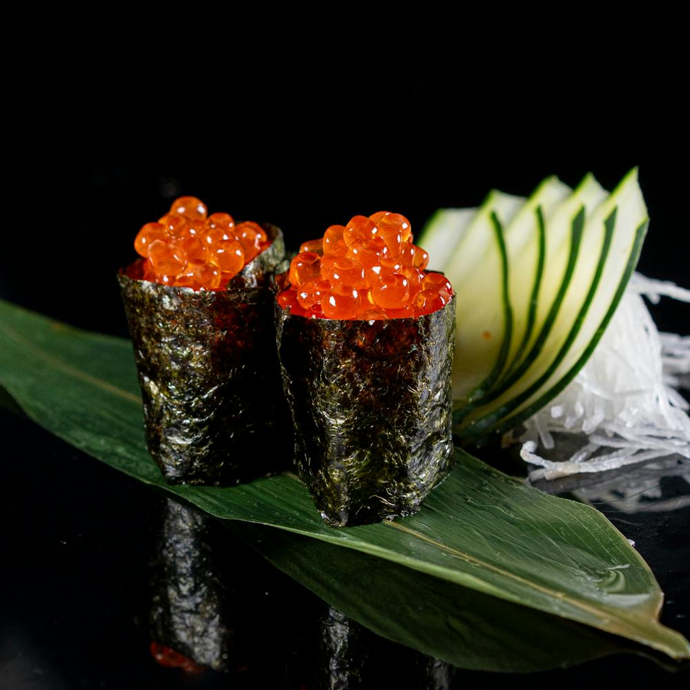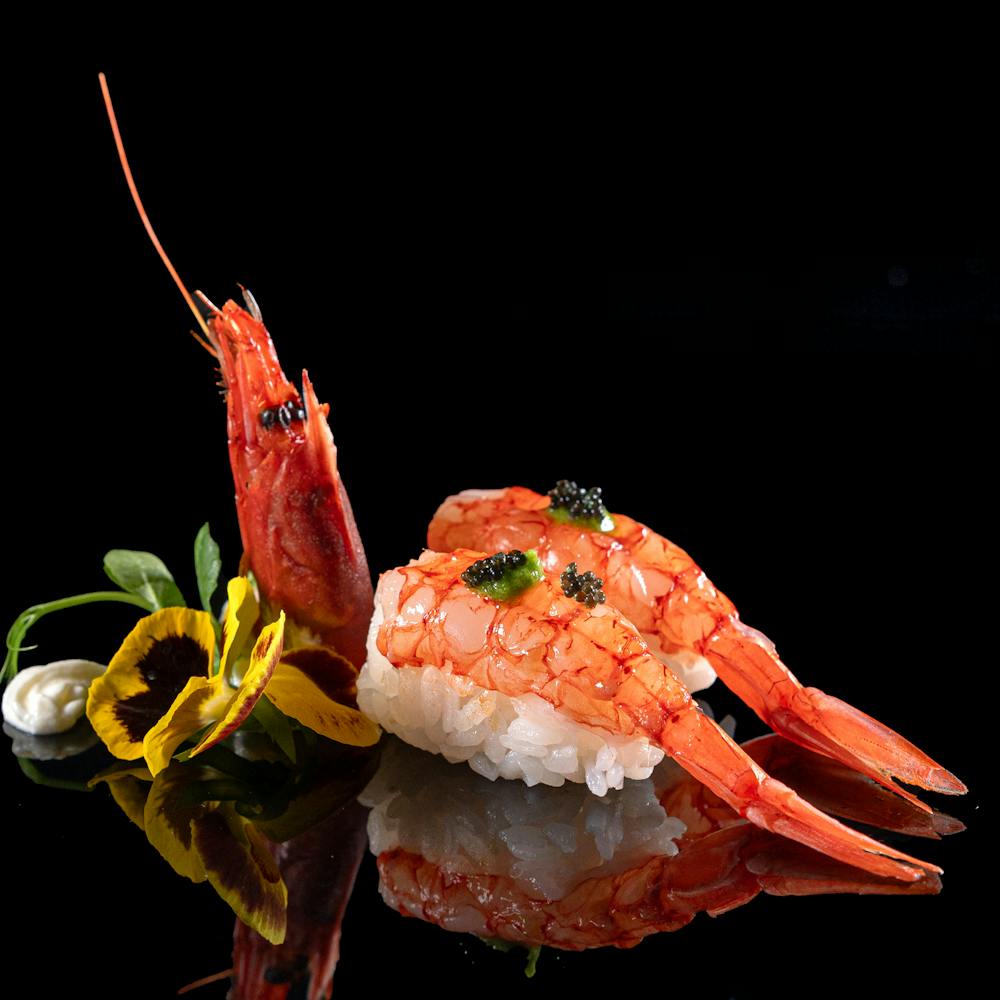 Gambero mazara, salsa rucola, tobiko nero. GLUTEN FREE. Specificare nell'ordine se si è celiaci.