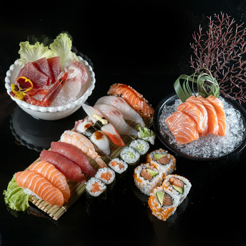 Salmone, tonno, branzino, edamame, frutta fresca, avocado e salsa lumii