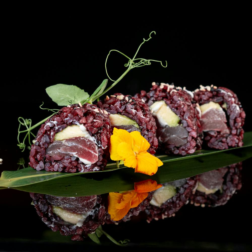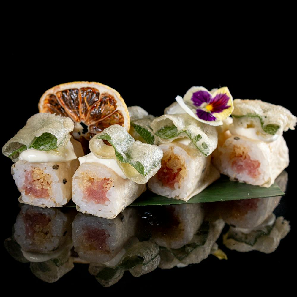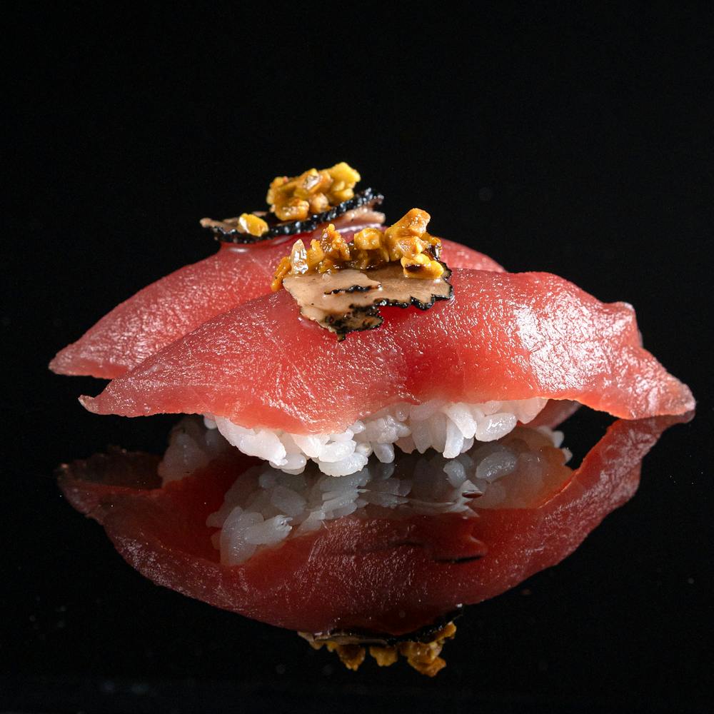 bocconcino di riso, tonno, guarnito con tartufo e granelli di pistacchio