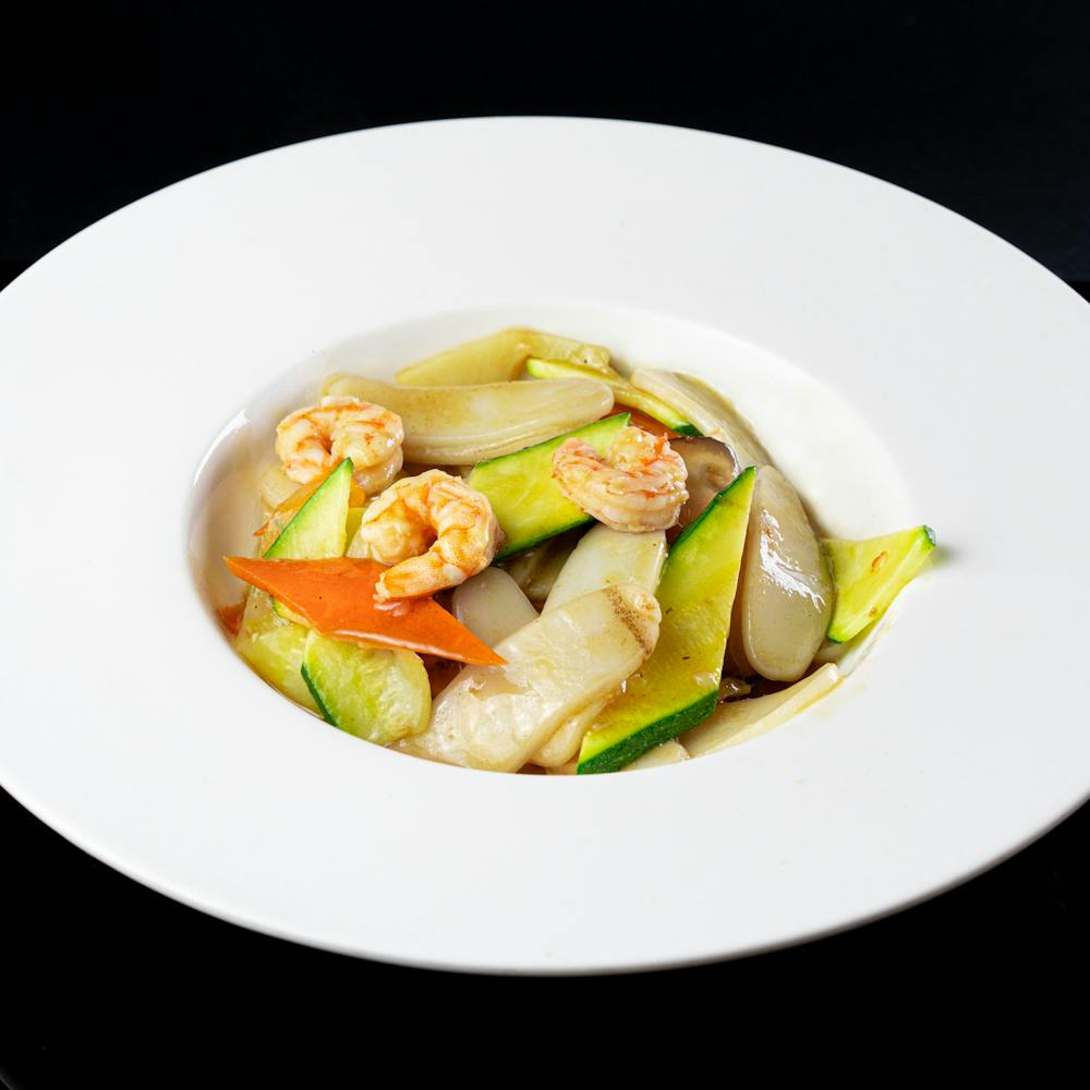 Gamberetti saltato con tre tipi di verdure