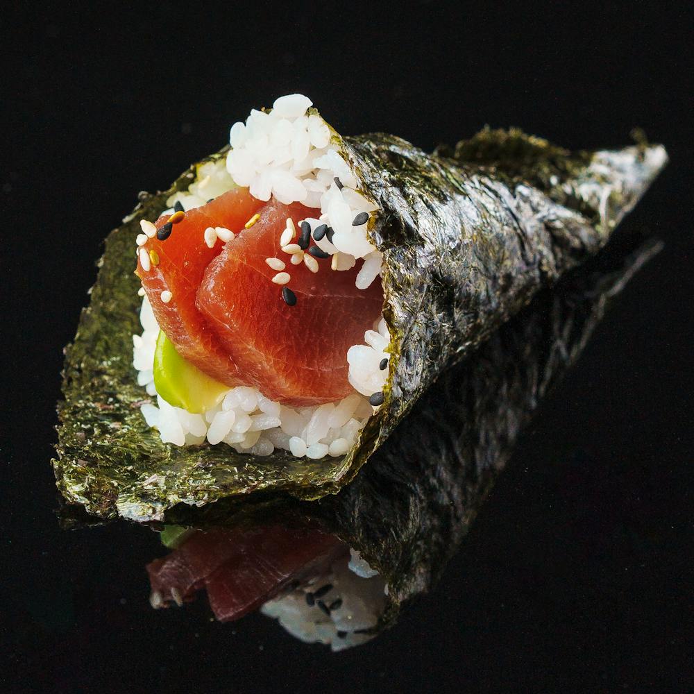 Tonno tataki in crosta di sesami, pomodorini, rucola, cetrioli, avocado, salsa tataki, su riso da sushi selezionato.